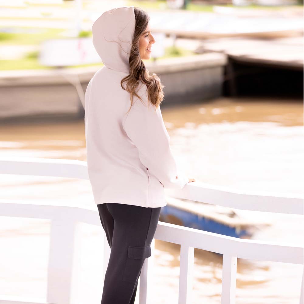 Canguro confeccionado con tejido de moletón y rib en contraste con capucha, bolsillos laterales y cordón para ajuste en capucha. Marca Cherry. Tejido compuesto por 50% algodón y 50% poliéster.