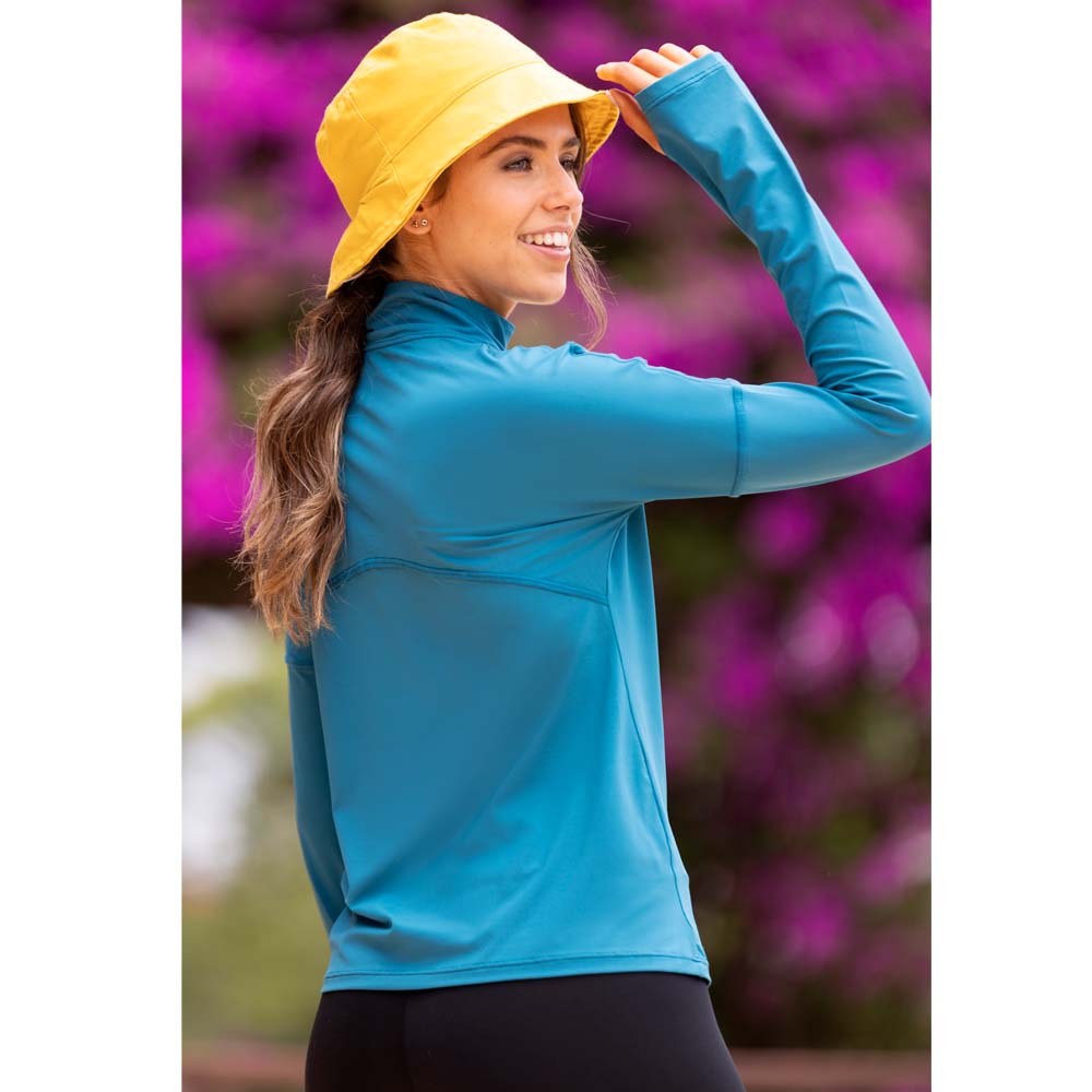 Remera mangas largas confeccionada con tejido dry fit con cuello alto y cierre, detalle de corte en mangas y diseño de mitón para el pulgar. Para actividades deportivas. Marca Cherry. Tejido compuesto por 80% poliéster y 20% elastano.